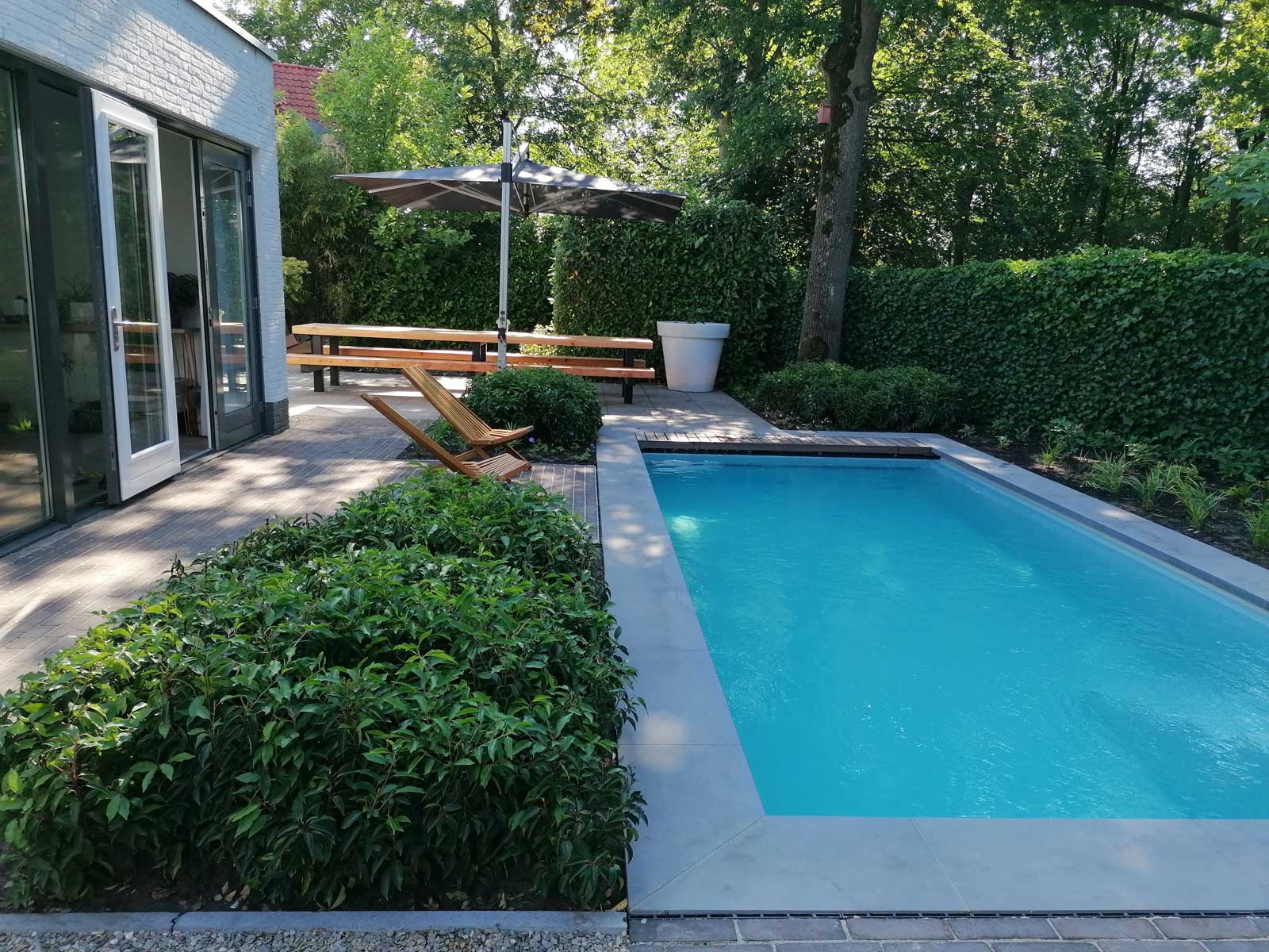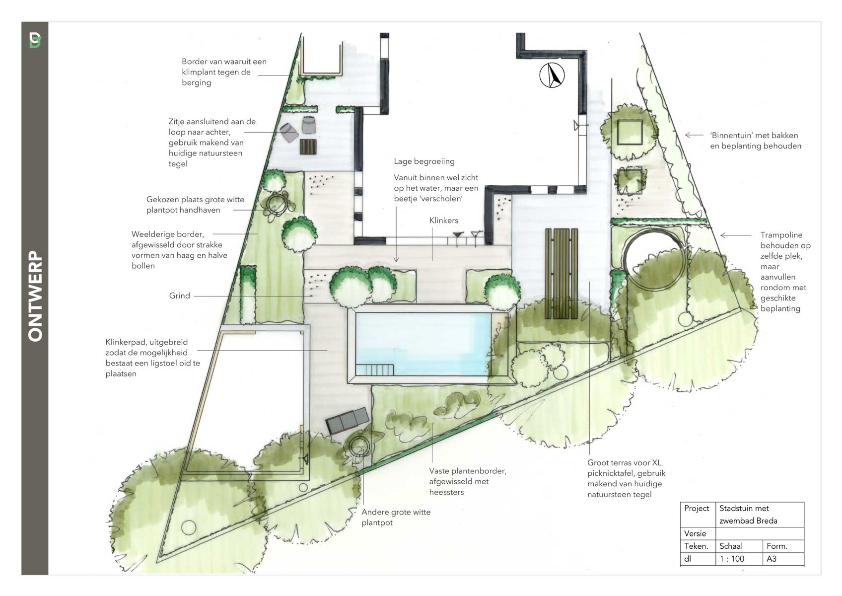 Omdat het in de zomer erg warm wordt op het huidige terras, wordt het zwembad (LPW City) op deze plek aangelegd. Een aantal mooie elementen zoals het chinees hardsteen kunnen deels worden behouden. Er worden weelderige borders aangelegd en er is ruimte voor de gewenste grote picknick tafel.