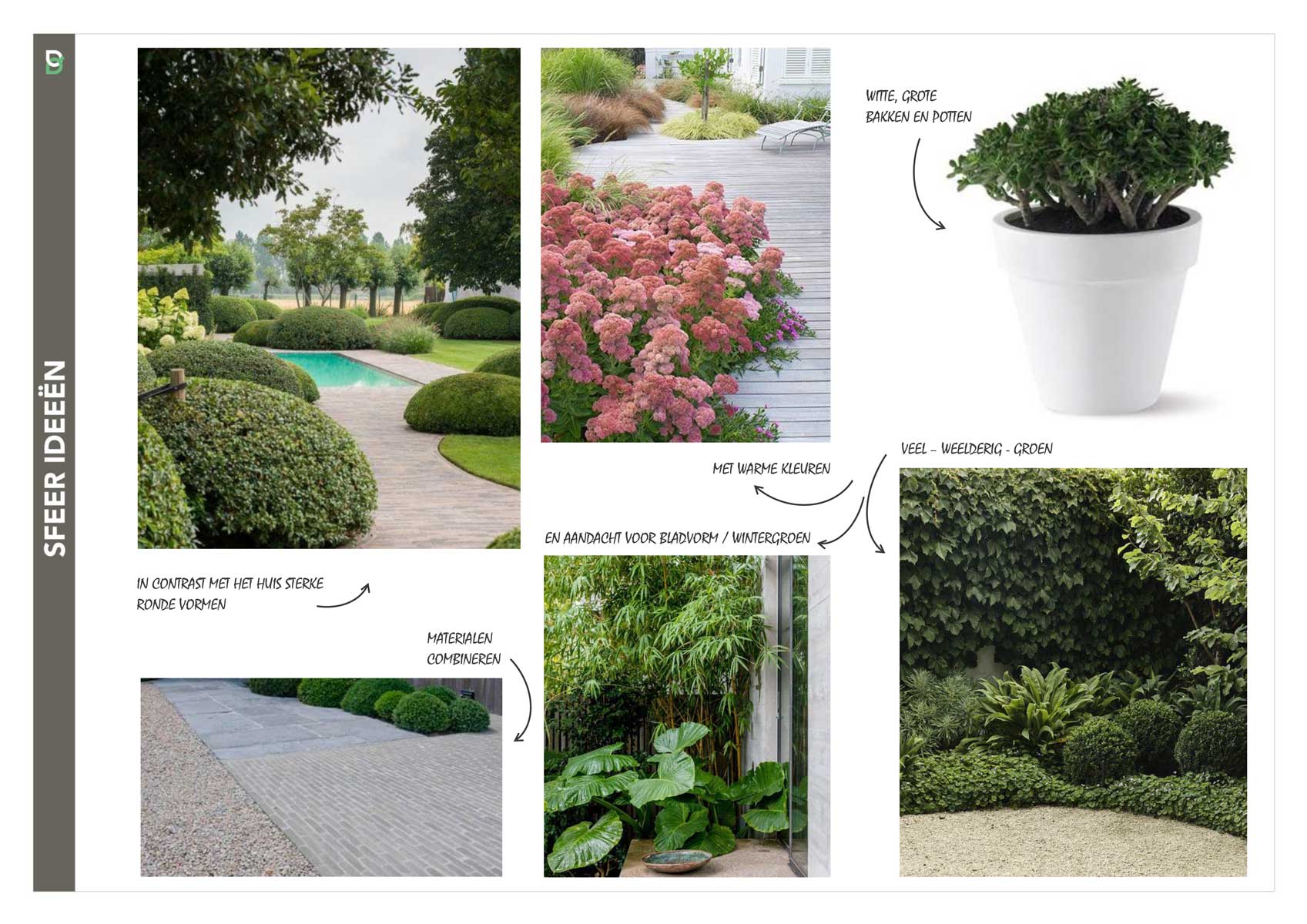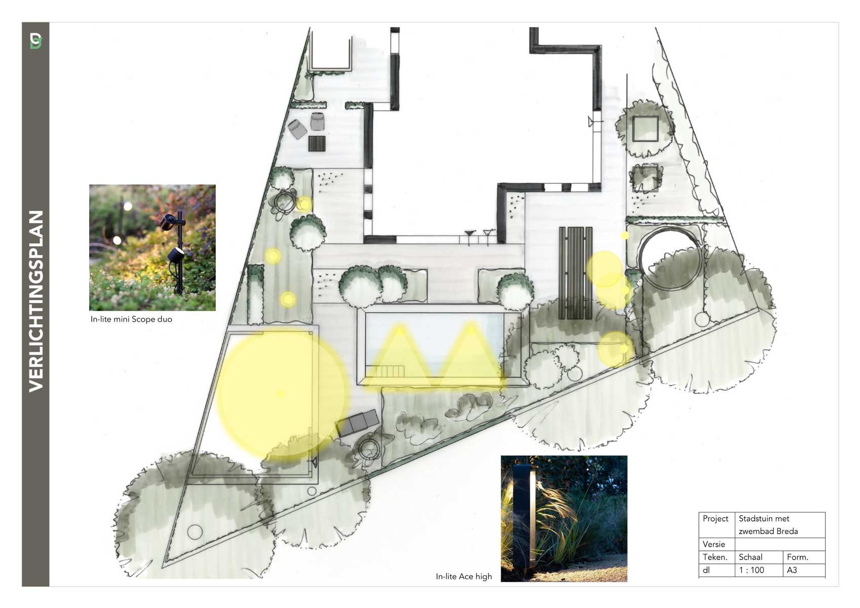 De bewoners van dit huis willen graag een zwembad in de tuin. Om de juiste ligging te bepalen én rekening te houden met de wens van een strakke tuin in combinatie met weelderige planten wordt er een tuinontwerp gemaakt. Met het ontwerp komen sfeerideeëb en een verlichtingsplan.